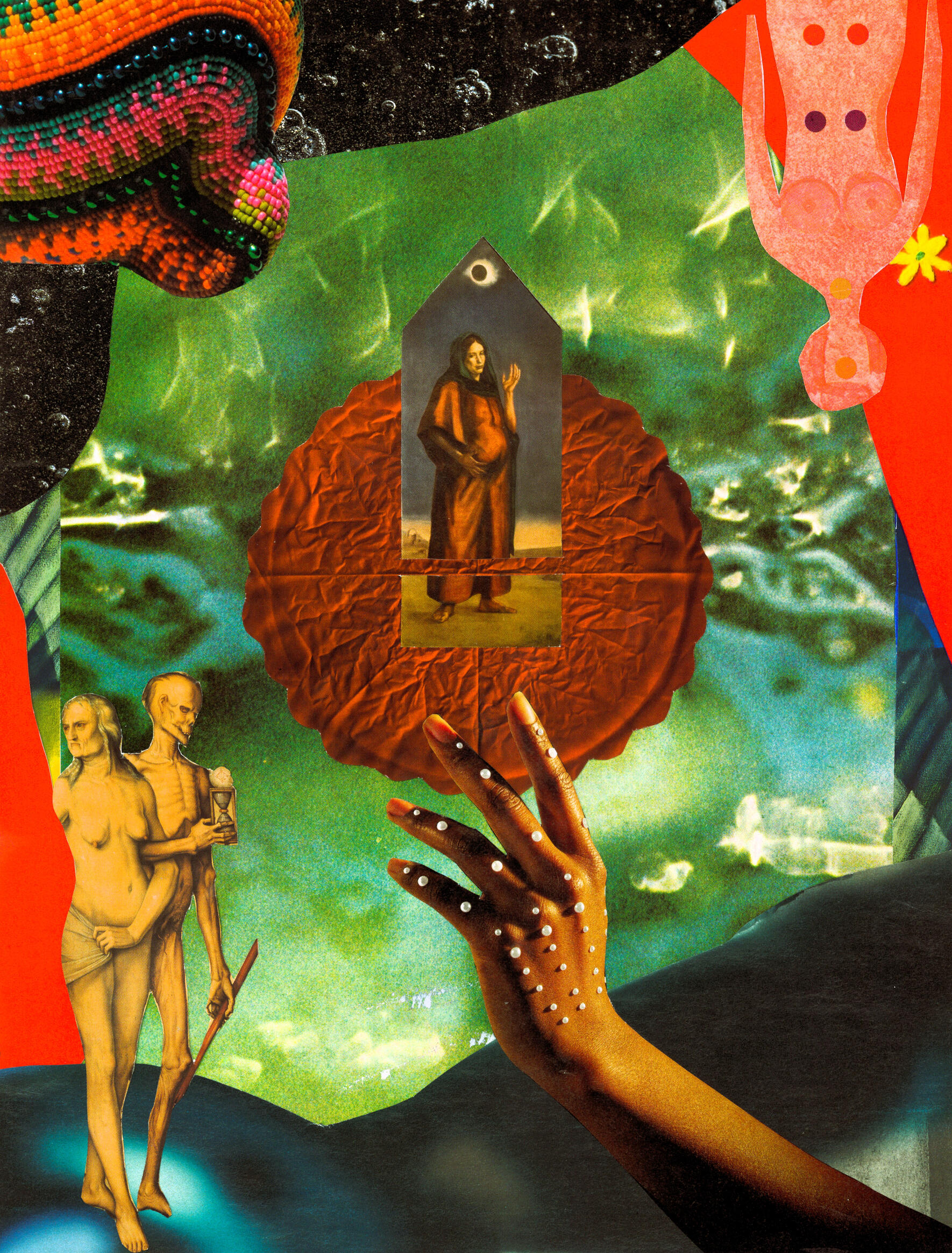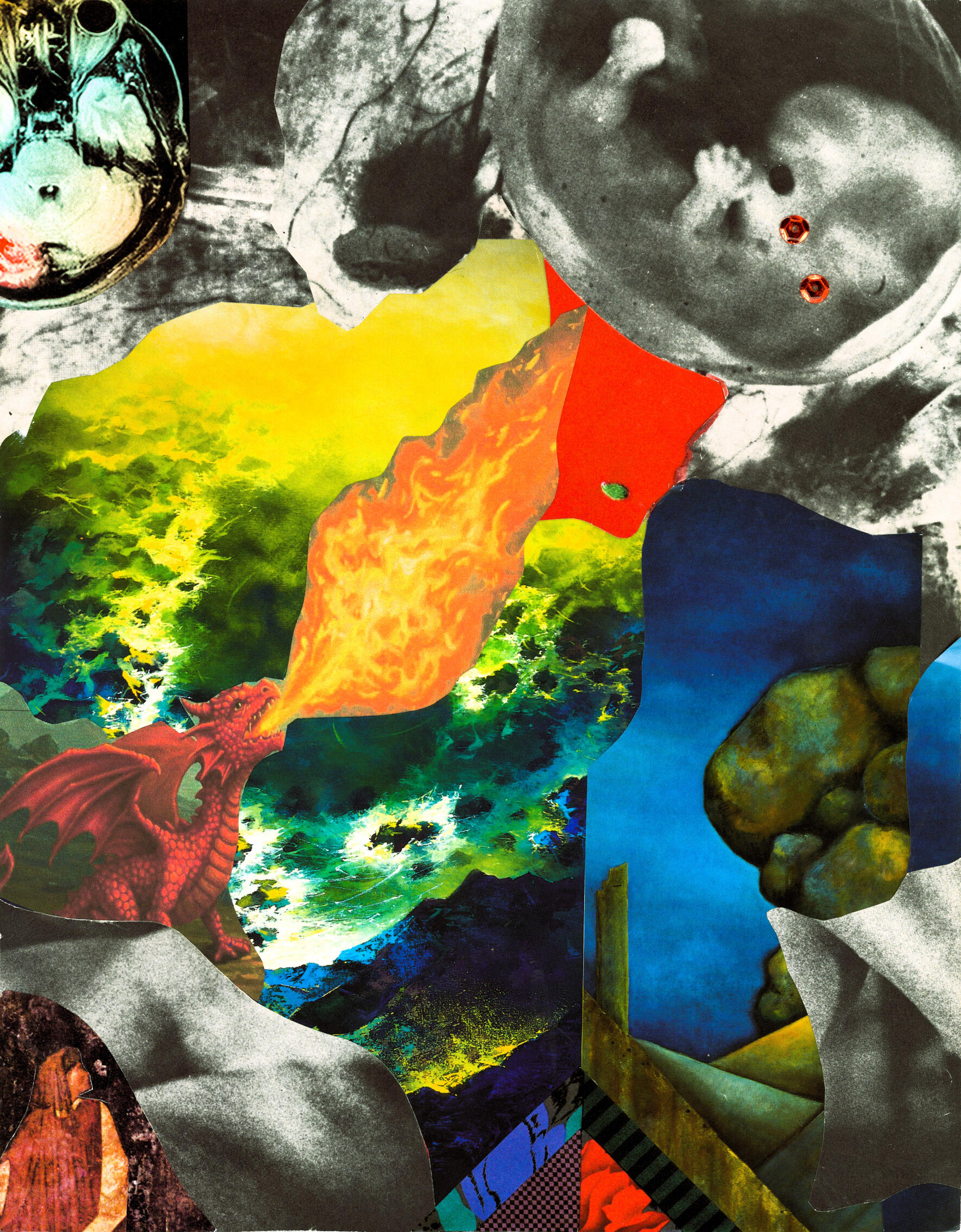 This piece explores the psychic terrain before birth: a liminal space where ancestral memory, biology, n unconscious projections converge to shape a self not yet fully formed. It draws a bit from Jungian motifs of the Self, myths of our collective shadow, n the threshold of incarnation where (I believe) identity is imagined (but not yet fully owned). I was drawn to the question of how we begin, not just biologically, but also spiritually n politically. What haunts the womb? What is carried in before the first breath?A red dragon emerges as mythic guardian and threat: - the fire of lineage and the weight of legacy. It hovers near the fetus like a question of protection or domination, echoing the collective shadow we inherit before we understand it. The brain floats overhead, the first architecture of awareness. The vessels drift like root systems, already reaching and binding.Beneath it all lies a silhouette. Gray and collapsed... as if gestation rests on the bones of something lost or unresolved. Roads cut across the background, etched into water and earth, suggesting destinies prewritten n maybe paths waiting.For me, this collage interrogates the myth of a neutral beginning. The fetus does not enter a blank slate but is written upon by fire, myth, biology, the psyche of the mother, and the shape of the world. The roads are laid before the first cry. Creation here is not serene. It's contested. The question I kept thinking about was who gets to script the myth of our becoming?