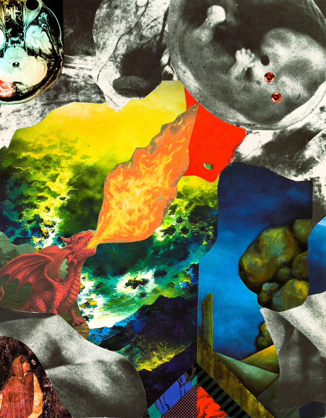 This piece explores the psychic terrain before birth: a liminal space where ancestral memory, biology, n unconscious projections converge to shape a self not yet fully formed. It draws a bit from Jungian motifs of the Self, myths of our collective shadow, n the threshold of incarnation where (I believe) identity is imagined (but not yet fully owned). I was drawn to the question of how we begin, not just biologically, but also spiritually n politically. What haunts the womb? What is carried in before the first breath?A red dragon emerges as mythic guardian and threat: - the fire of lineage and the weight of legacy. It hovers near the fetus like a question of protection or domination, echoing the collective shadow we inherit before we understand it. The brain floats overhead, the first architecture of awareness. The vessels drift like root systems, already reaching and binding.Beneath it all lies a silhouette. Gray and collapsed... as if gestation rests on the bones of something lost or unresolved. Roads cut across the background, etched into water and earth, suggesting destinies prewritten n maybe paths waiting.For me, this collage interrogates the myth of a neutral beginning. The fetus does not enter a blank slate but is written upon by fire, myth, biology, the psyche of the mother, and the shape of the world. The roads are laid before the first cry. Creation here is not serene. It's contested. The question I kept thinking about was who gets to script the myth of our becoming?