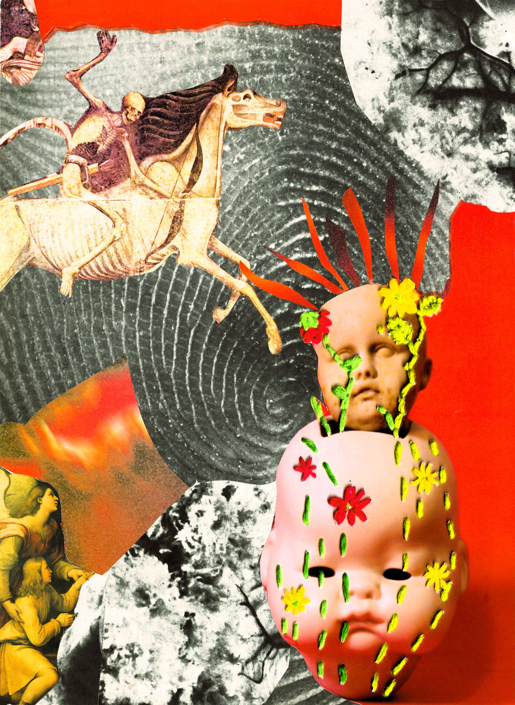In this piece, a fingerprint spans the backdrop -- an undeniable marker of identity, yet impersonal in its repetition. Death on horseback storms across the sky, signaling that she is not merely an end, but a force shaping the beginning. Her presence felt necessary. She’s a reminder that what we inherit often comes cloaked in silence and plenty of times justified as tradition.Below, a mother and child look skyward into an omen. What they see challenges them to find a better path forward. Because beneath their gaze, the ground is littered with dismembered dolls -- severed heads with stitched faces, vacant eyes, n artificial flowers blooming from wounds. They represent the cultural baseline for children: subservient, decorative, voiceless, targets. These heads aren’t relics of violence. They’re the current templates. They’re the baseline.As I assembled these elements, I realized what the mother and child were seeing. They weren’t just witnesses. They were recipients of a legacy. But something in their posture resisted. They saw what the world offers as a guideline and decided not to comply. This is where the piece turns. That gaze upward became an act of refusal.Children don’t arrive untouched. They’re born into frameworks shaped by fear, control, and inherited systems of power. The myth of innocence often hides the fact that childhood is where society rehearses its violence - through indoctrination, obedience, and self-erasure.The ancestral contract may be written in silence and repetition, but here, I wanted to capture a crack in that spell — the moment when recognition becomes resistance.